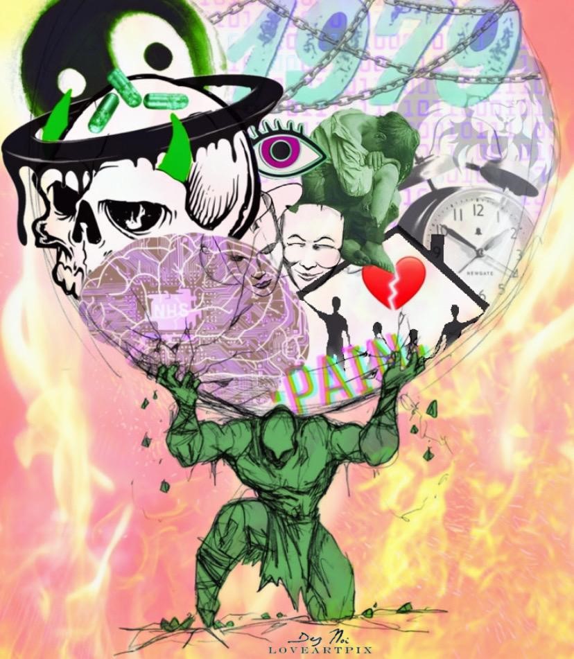 The digital brain shows the logical & robotic way my brain works & I put the NHS in the centre to show the constant battle for help I have with some of the staff, getting them to fully understand & how that is always on my mind. This also represents how I can come across very cold & blunt due to feeling flat & empty – I also think this is a reason people think I am strong because I can say how I feel due to detachment of feelings.